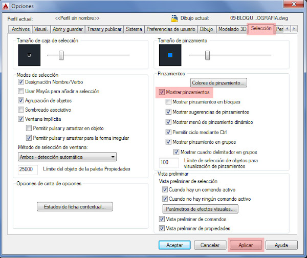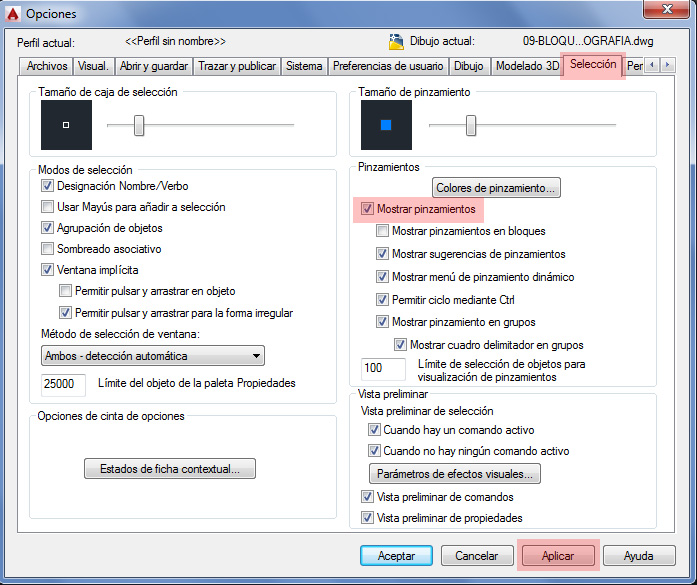 Ahora se abrirá una nueva ventana en la que tendremos que pulsar sobre la pestaña de SELECCIÓN y marcaremos la casilla de MOSTRAR PINZAMIENTOS. Ahora tan solos pulsamos en APLICAR Y ACEPTAR.