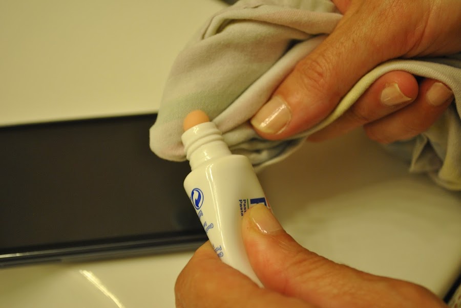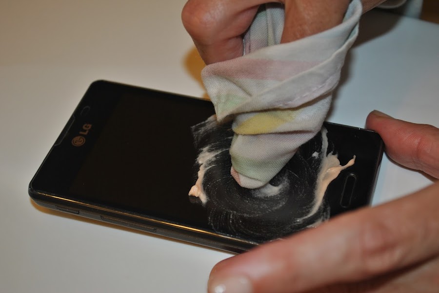Sólo tenemos que apagar nuestro móvil, mojar un poco nuestro paño y con el dedo iremos extendiendo la pasta por toda la pantalla.