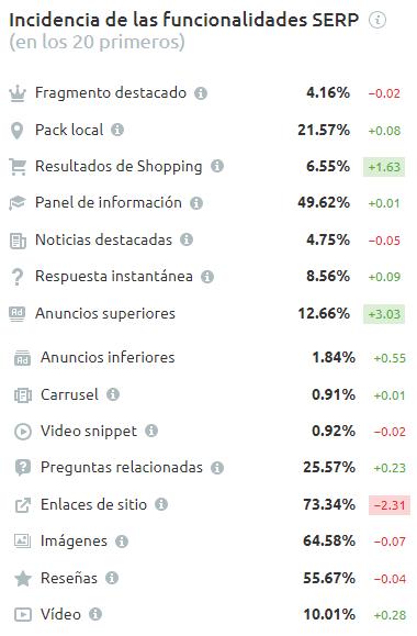 En este gráfico de SEMrush se observan las peso y variaciones de estas funcionalidades entre los 20 primeros resultados: