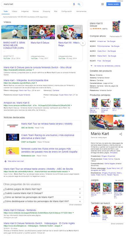 ¿Wikipedia posición 3 para una consulta genérica como “mario kart”? ¿Amazon y El Corte Inglés posicionados en Top 10? El carrusel de vídeos, bueno. ¿Noticias destacadas y abc.es posicionado? Y para esta consulta, ¿realmente es útil para los usuarios el box de “Otras preguntas”? Si os fijáis, salvo la propia Nintendo ninguna web de juegos en primera página. Y así con multitud de consultas que históricamente han posicionado sitios web diferentes a los que ahora Google muestra.