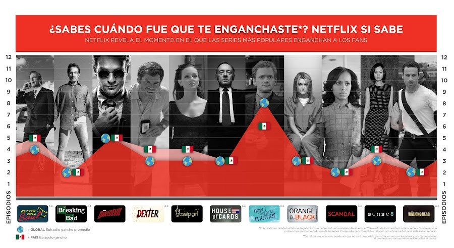 Pues Netflix hizo un estudio que refleja el episodio preciso en que el público se picó con una serie alrededor del mundo y los resultados son muy interesantes. Si bien se pensaba que el llamado episodio piloto era el que definía si el espectador se queda o se va, la realidad es que la forma en que ahora vemos la televisión en demanda con una o más temporadas disponibles a nuestro antojo cambia la perspectiva.