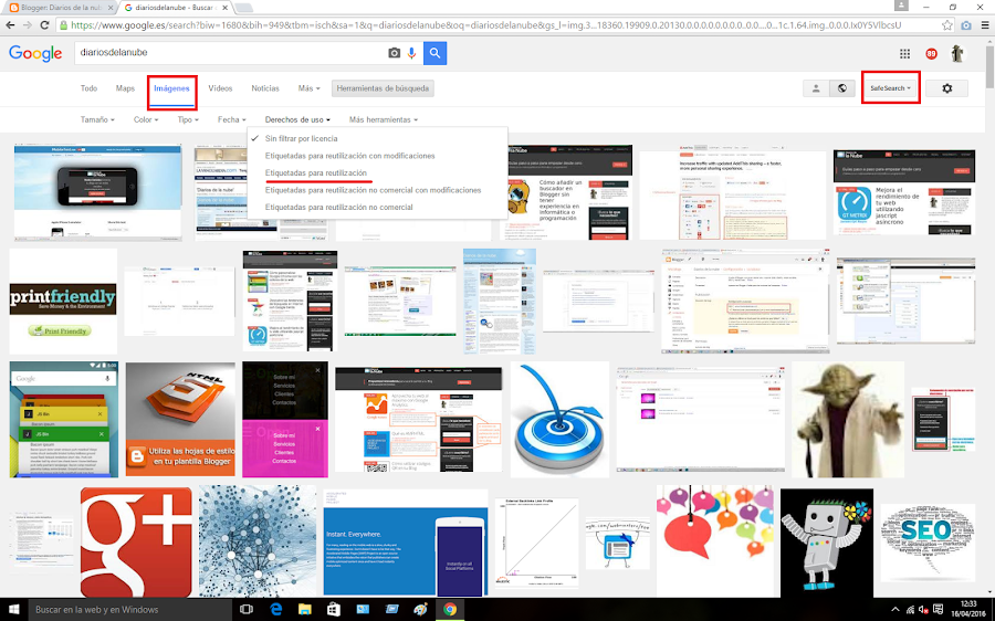 En Google, si tras realizar una búsqueda haces "clic" en "Imágenes" y después accedes a "Herramientas de búsqueda", verás que te se te ofrecerá la posibilidad de buscar aquellas que están "etiquetadas para reutilización" o incluso para modificación: