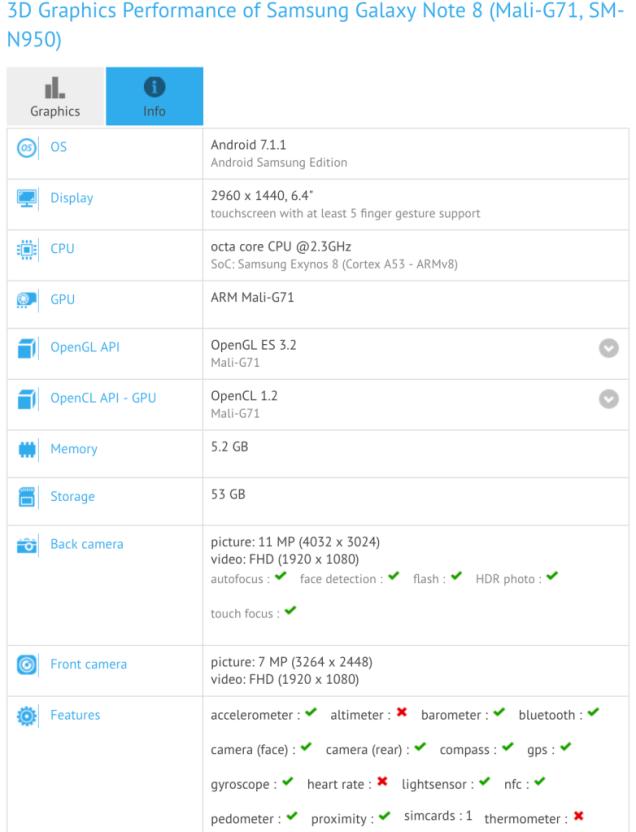 Los chicos de GFX Bench realizaron las pruebas de rendimiento del Galaxy Note 8 que incluye el nuevo procesador Exynos 8 de Samsung. Aunque no publicaron los resultados, sí publicaron las especificaciones finales.