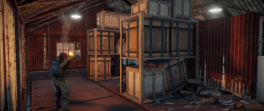 Loot: Detrás de la puerta blindada y de camino hasta llegar a la puerta azul, encontrarás 4 cajas de madera o militar.