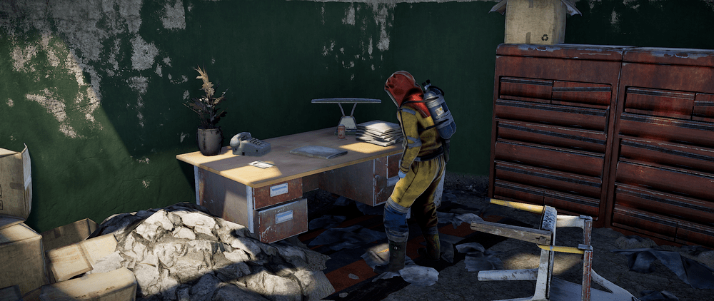 Ingrese en el hangar, y dirígete hacia la puerta verde que está al fondo a la derecha.