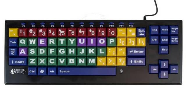 El teclado adaptado KinderBoard agrupa por colores a las consonantes, vocales, números y signos de puntuación. Incluye solo las teclas más esenciales, no tiene funciones superiores y las letras son también de mayor tamaño (mide cada una 2cm). Está especialmente indicado como primer teclado para niños o para personas con discapacidad intelectual porque el código de color hace que sea más fácil identificar, discriminar y aprender la localización de cada tecla. También está indicado para personas con baja visión ya que las categorías de colores hacen que haya una mayor discriminación visual.