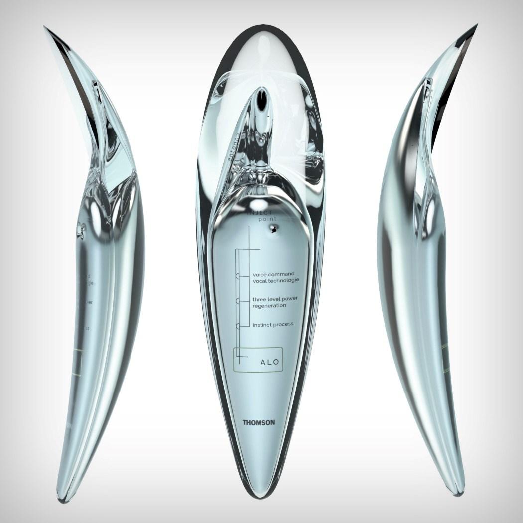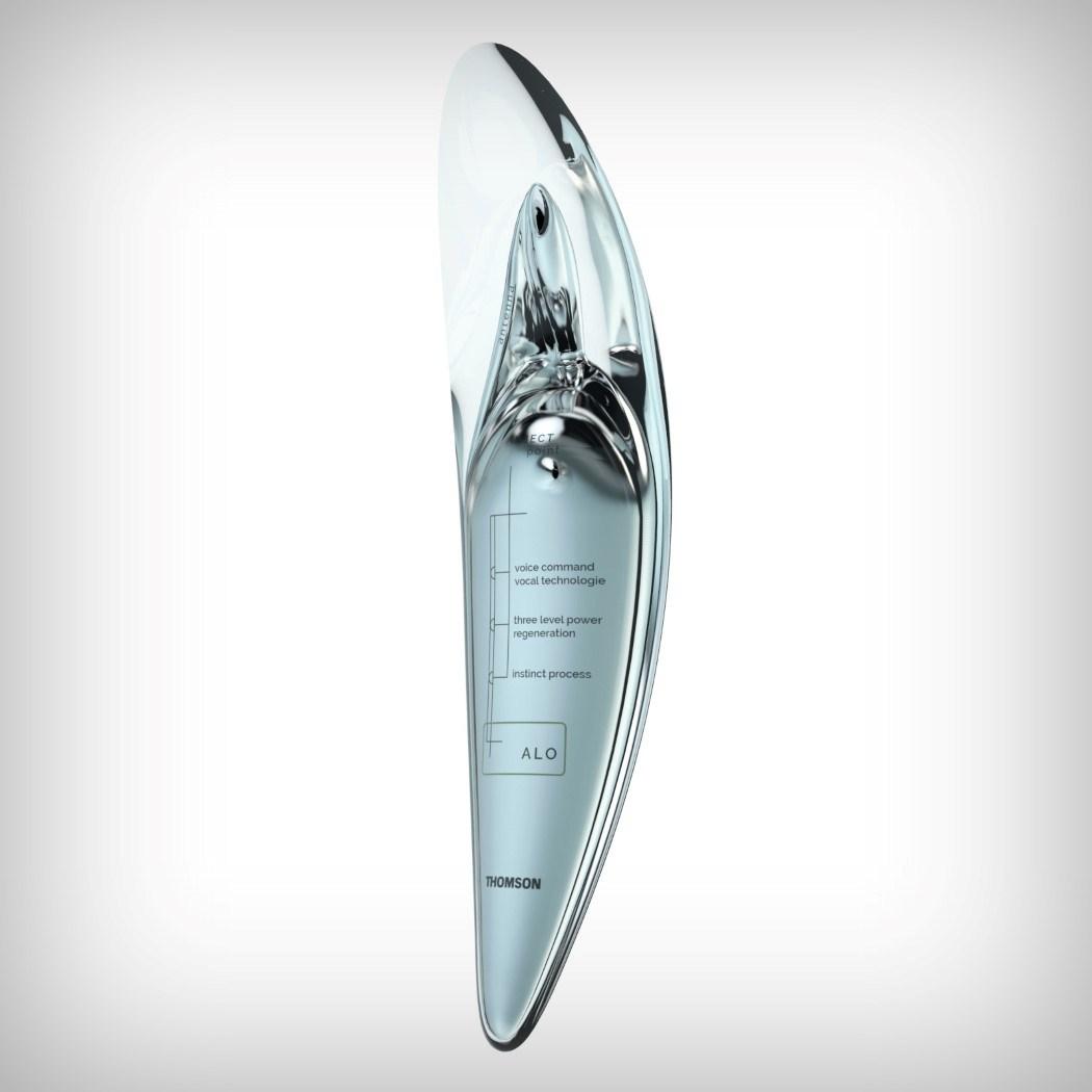 Hecho para un futuro dominado por Siris y Alexas, el teléfono Alo viene sin una pantalla y se basa únicamente en la comunicación de voz. El cuerpo del teléfono está hecho de un material gelatinoso envuelto alrededor de un unibody de aluminio, y su forma fue diseñada para ser colocada perpetuamente contra la oreja.