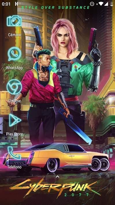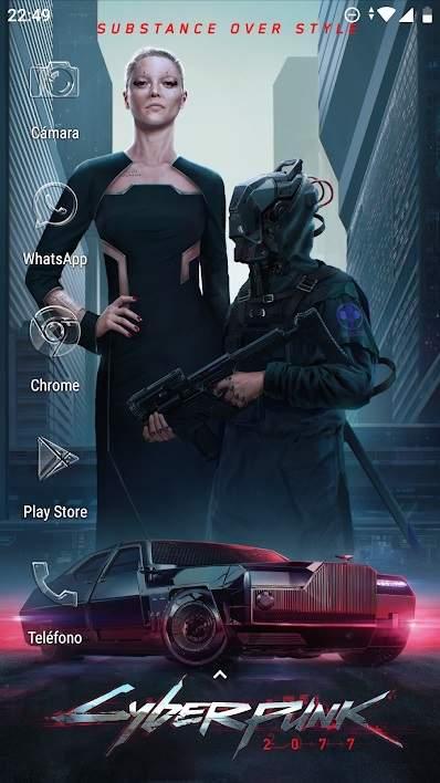 A continuación, hemos preparado otros themes basados en las diversas tribus urbanas o «estilos» que pueblan las calles de Cyberpunk 2077. En todos ellos hemos sacado los iconos del dock y los hemos colocado en disposición vertical. El launcher utilizado sigue siendo Nova Launcher (aunque se puede utilizar cualquier otro lanzador como los que comentamos en el párrafo anterior), y se ha prescindido de widgets para evitar una mayor saturación visual.