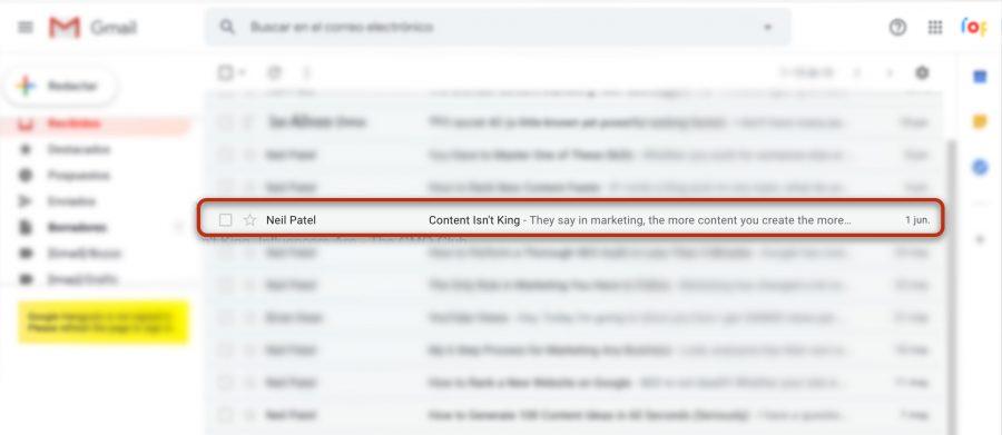 Aunque no redactó un artículo si no un video. Se trata del super conocido Neil Patel. El primero de este mes me envió un correo que decía exactamente esto: «El contenido no es el Rey«. Como se puede apreciar el la imagen.
