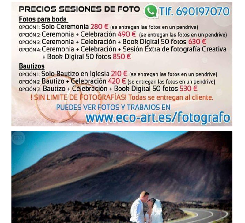 Mi primera reacción es un poco de sorpresa. Como veréis a continuación, las fotos que tiene en el anuncio son bastante buenas, y mi primer pensamiento es: un fotógrafo de bodas, con estas fotos, haciendo publicidad en una página como milanuncios y con precios no excesivamente altos, es un poco raro…