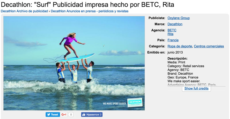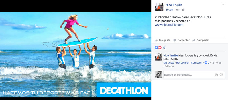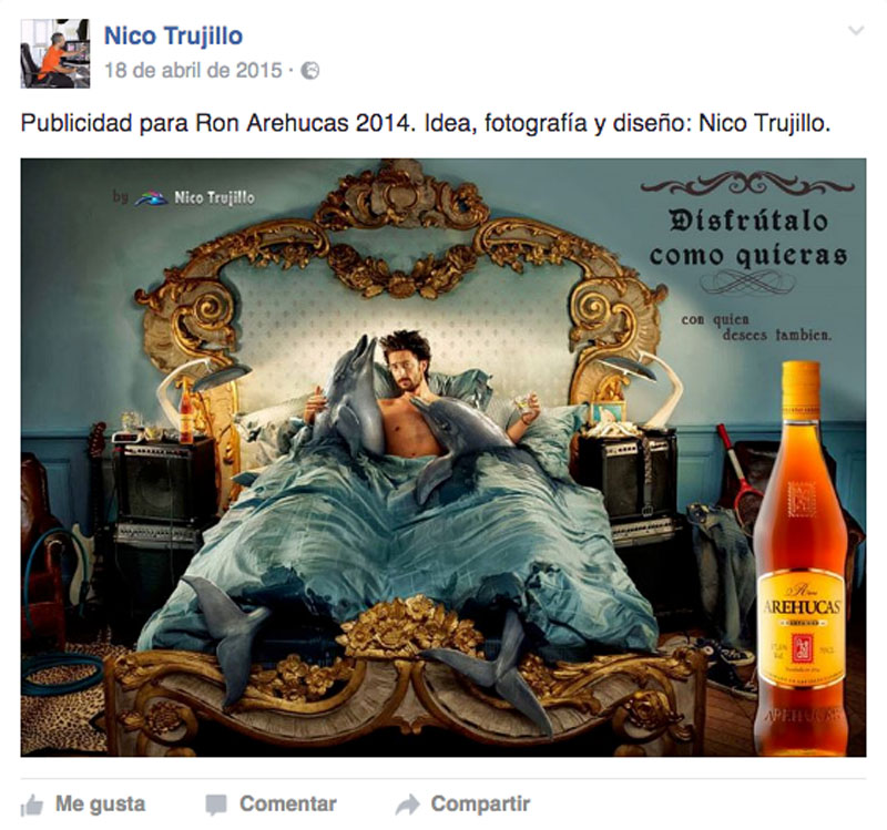 Me he cansado de mirar y buscar “sus trabajos” y el 90% (y quizás me quedo corto) de todo lo que busqué, no es suyo. Trabajo de photoshop (como mucho) sobre fotografías y campañas publicitarias de aquí y de allá. Y para que quede para la posteridad, a continuación, les dejo algunos ejemplos sacados todos de su timeline de facebook.