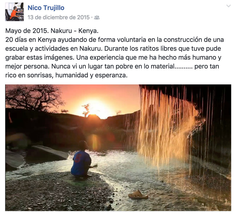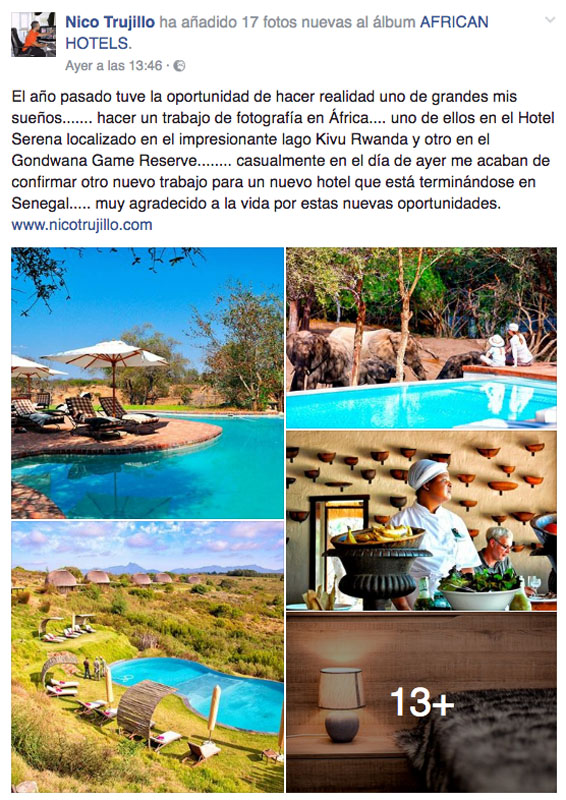 ¡Qué grande! ¡Cumpliendo sueños! Hombre, cumplir, lo que se dice cumplir, el señor Nico Trujillo lo único que cumple son años. Lo de hacer fotografía de hoteles africanos, como que aún le queda un poco grande XD