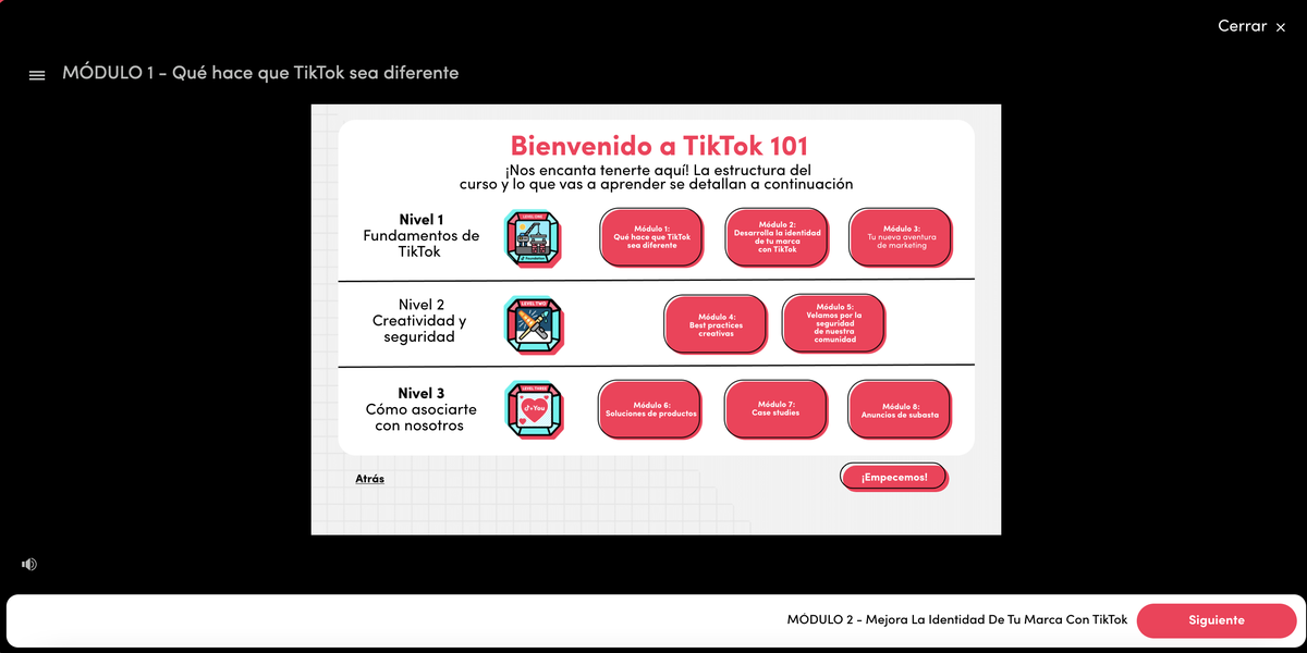 Por el momento tan solo hay un curso que podamos realizar en español, TikTok 101. Este módulo de iniciación se centra en una introducción general a TikTok, abarcando aspectos como las mejores prácticas creativas, la seguridad de la comunidad y soluciones de productos más específicos.