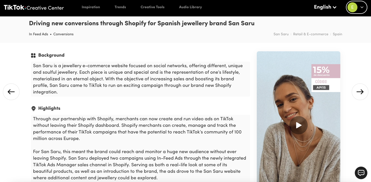 Si además de formarnos en su academia decidimos seguir aprendiendo del funcionamiento de TikTok y sumergiéndonos en la red social, su plataforma de Creative Center proporciona a las marcas todos los datos necesarios para preparar sus próximas campañas acorde a las últimas tendencias y casos de éxito en la plataforma.