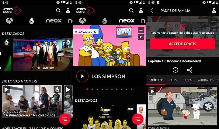 La app con la que podemos ver todo el contenido a la carta y en directo de Antena 3, La Sexta, NEOX, Nova, MEGA y demás canales de Atresmedia.Lo bueno: Las emisiones en directo funcionan a la perfección. Lo mejor para ver los Simpsons en directo, Big Bang Theory, o cualquier otro programa/serie que estén emitiendo en vivo. Todo ello sin necesidad de registro y de forma razonablemente fluida.