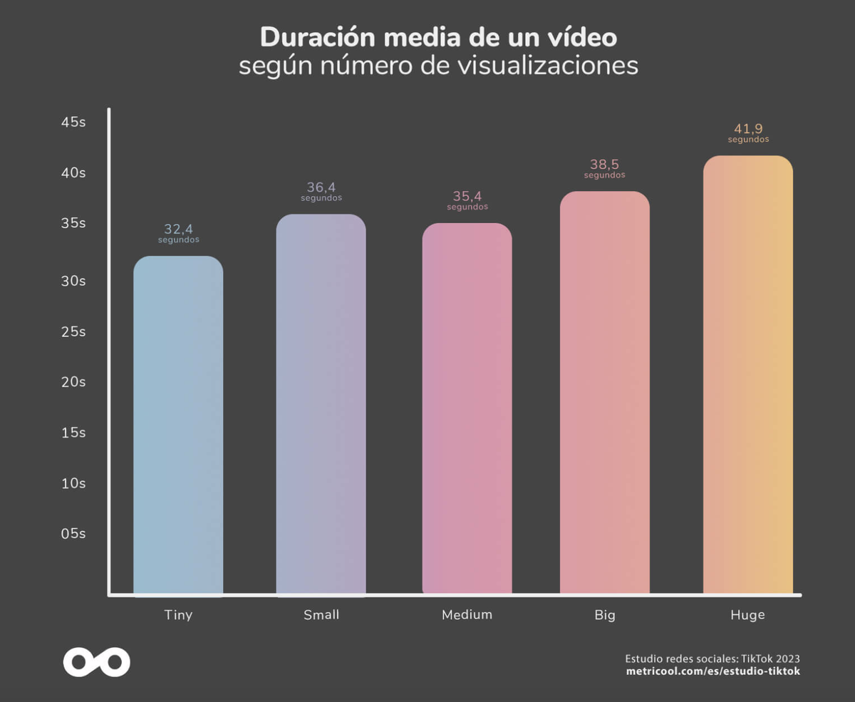 Las cuentas más pequeñas, Tiny (0-100 seguidores) cuentan con una media de 32,4 segundos frente a los 41,9 de media de las cuentas Huge (más de 50K de seguidores)
