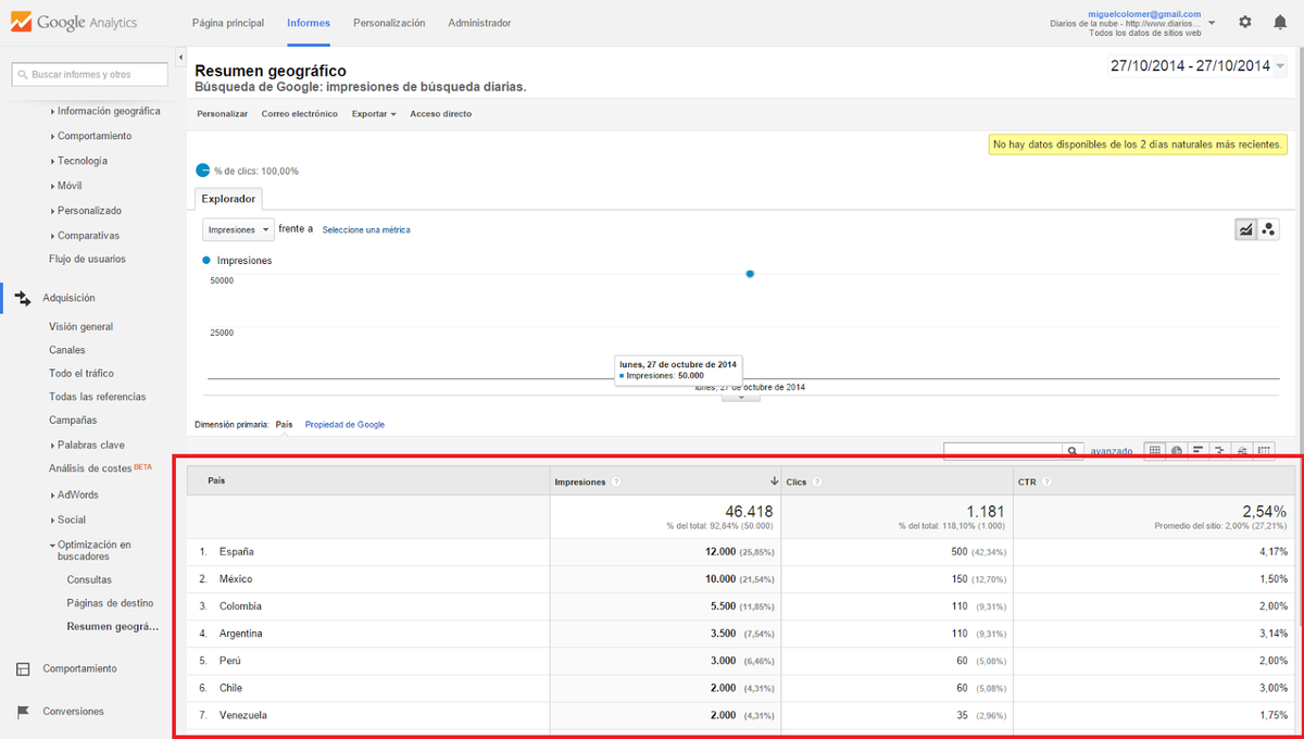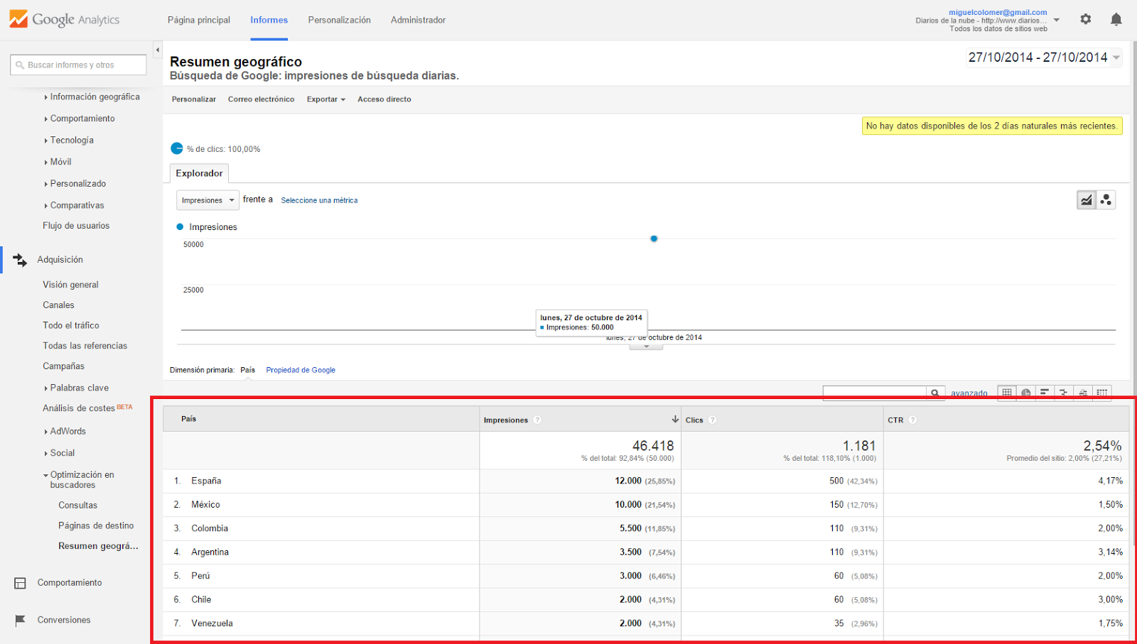 Veremos a continuación desde el punto de vista de la optimización en buscadores de Analytics, un pequeño resumen geográfico por país. Analizaremos el comportamiento de los usuarios por país por medio de las veces que tu página web ha aparecido en Google dentro de las búsquedas en su país y las veces que han hecho "clic" en tu web cuando les ha aparecido en los resultados de dichas búsquedas.
