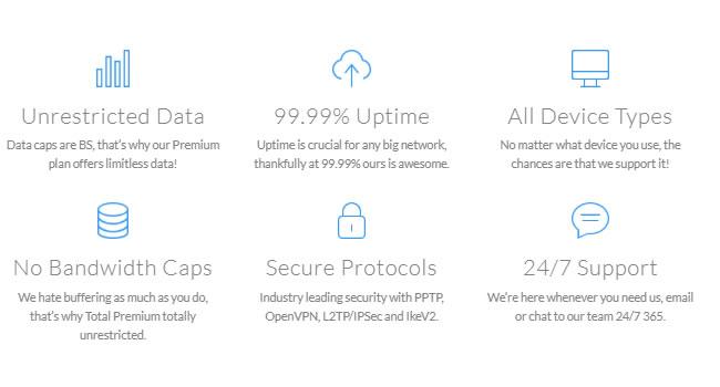 Como mencionamos previamente en el segmento anterior esta VPN ofrece un paquete completamente gratuito el cual incluye: acceso a varios protocolos de seguridad como PPTP, L2TP, IPSec, OpenVPN e IkeV2, un ancho de banda ilimitado, acceso a tres ubicaciones, transferencias de datos limitadas y una conexión en simultáneo. Debes saber que esta versión realmente es solo una forma de probar el servicio, debido a que tienen algunas restricciones estrictas.Total VPN ilimitado