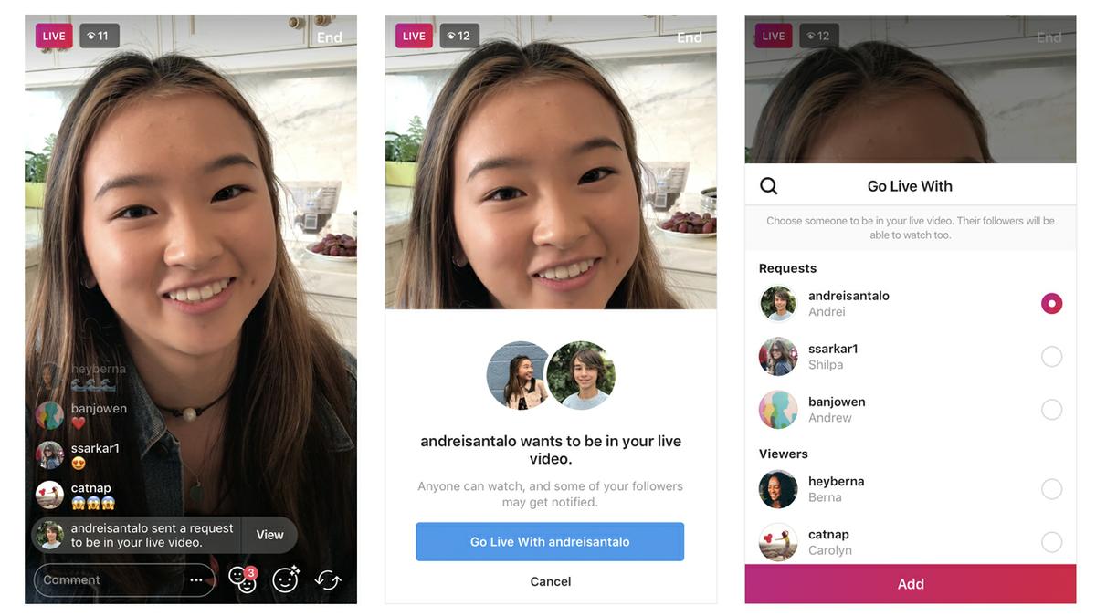 La nueva forma de transmisión en vivo de Instagram funciona similar a Periscope, lo que permite a los usuarios que ven una transmisión en vivo, enviar comentarios y corazones en tiempo real. Sumado a ello, ahora también, los usuarios encontrarán un botón para solicitarle a quien realiza la transmisión en vivo unirse. También el usuario puede invitar a otros antes de comenzar, para hacer la transmisión en conjunto. Una vez aceptada la solicitud de unirse la pantalla de la transmisión se divide a la mitad, de forma vertical u horizontal, dependiendo de cómo tengamos orientado nuestro dispositivo.