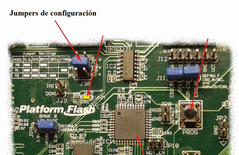 Podemos hacer click derecho en cada uno de los dispositivos y cargar el archivo de configuración requerido. Debemos tener en cuenta que si cargamos la configuración en el FPGA, el programa funcionará hasta que apaguemos la fuente de poder de la placa (memoria volátil), y en el caso de cargar la configuración en la memoria PROM (xcf04s) el programa se mantendrá luego de quitar la alimentación. En el caso de esta placa en particular, se pueden cargar archivos de configuración en una memoria SPI/BPI, la memoria PROM y en un CPLD (xc2c64a), pero esto lo analizaremos en otra ocasión. Además, como esta placa la tengo desde hace años, y he hecho varias pruebas con ella, no puedo asegurar la posición original de los jumpers de configuración, los cuales están ubicados en la parte superior derecha de la placa (fig. 7).