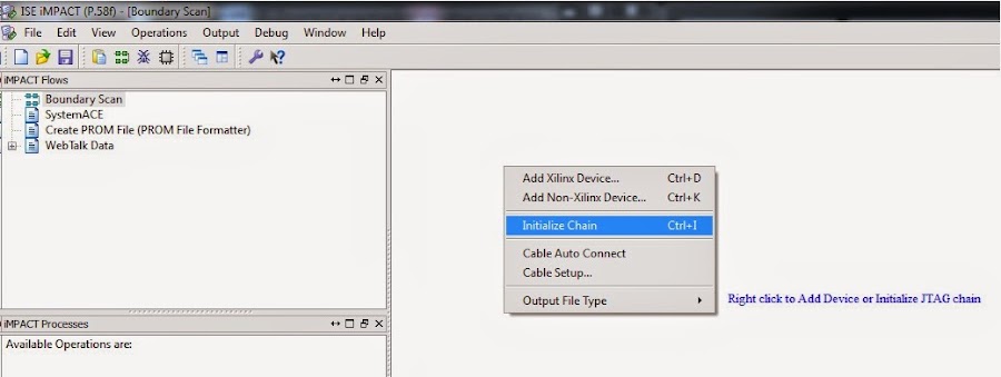 Se abrirá la ventana del "ISE iMPACT". iMPACT nos permite programar un FPGA de Xilinx si disponemos del cable de programación del fabricante, el cual puede ser un cable JTAG o el programador incluido en las placas del desarrollo (el microcontrolador). Para esto primero tenemos que hacer que el software reconozca la placa de desarrollo haciendo doble click en "Boundary Scan", luego hacemos click derecho en la parte derecha de la pantalla donde dice "Right click to Add..." y seleccionamos "Initialize Chain" (fig. 5).