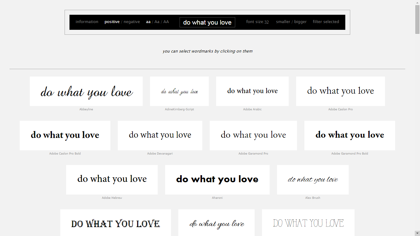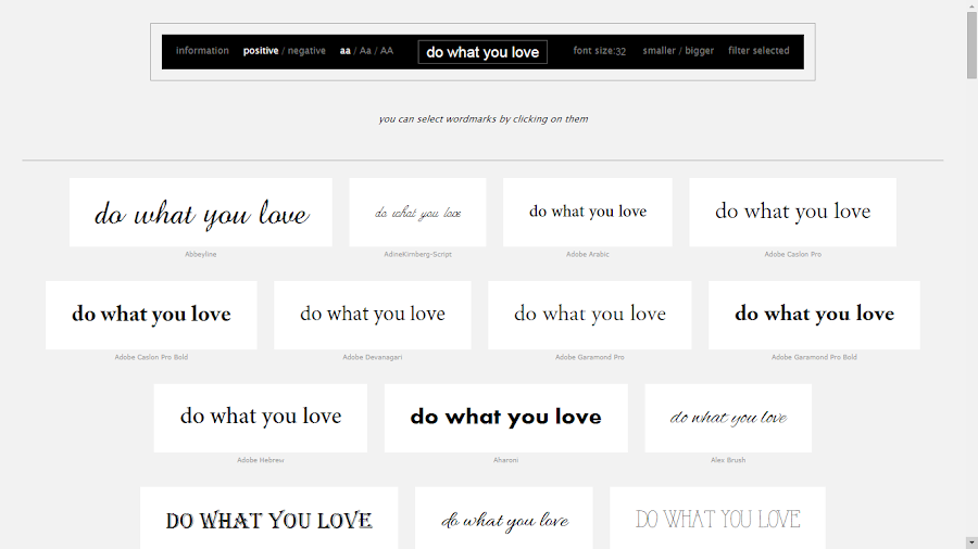 Se llama Wordmark.it y es una web que nos deja teclear aquello que queramos (el nombre de nuestro blog si queremos hacer una cabecera nueva, una frase para hacer un cartelito con una cita, etc.) y nos lo muestra automáticamente en un montón de fuentes: