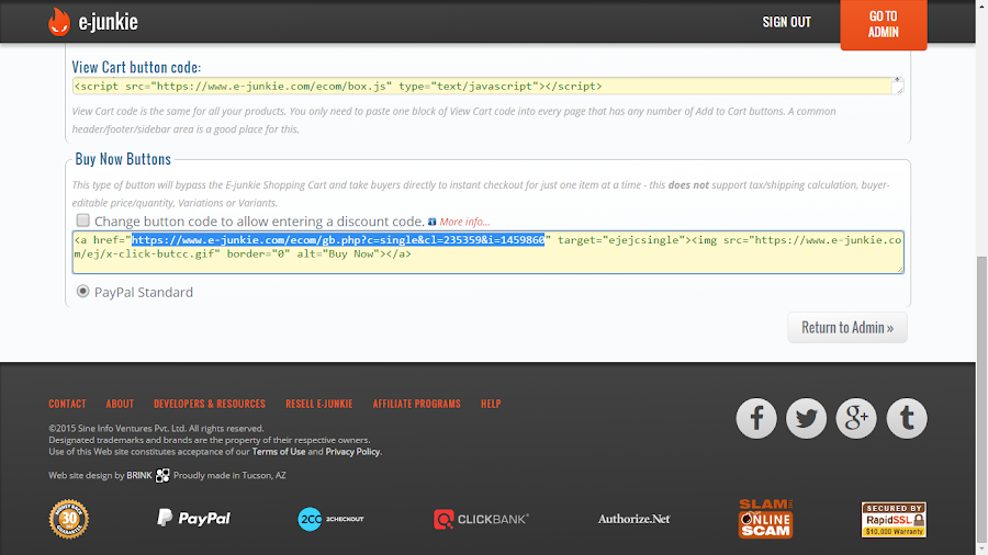8) Una vez cerrada, volvéis a la otra (paso 5) y ahí ya tenéis los botones. Si usáis sus códigos completos, os mostrará el botón de compra de e-junkie, que yo no uso.