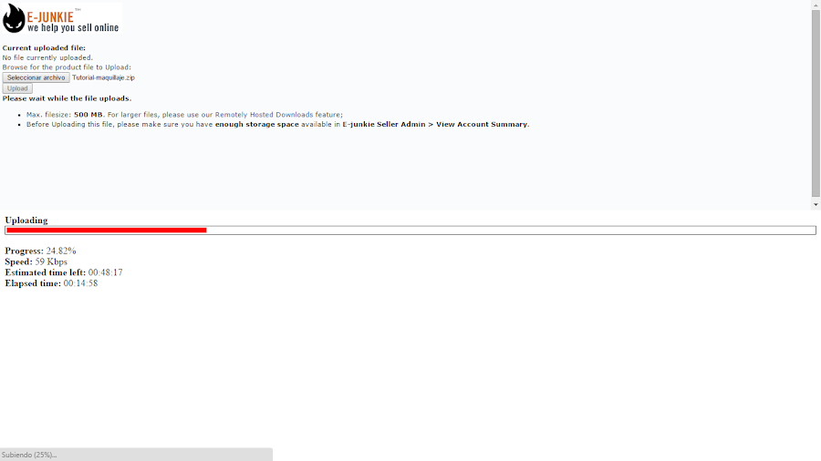 6) Cuando le demos a Upload product file, se nos abrirá una ventanita nueva. En ella no tenemos más que subir nuestro producto eligiéndolo de nuestro ordenador y dándole a Upload: