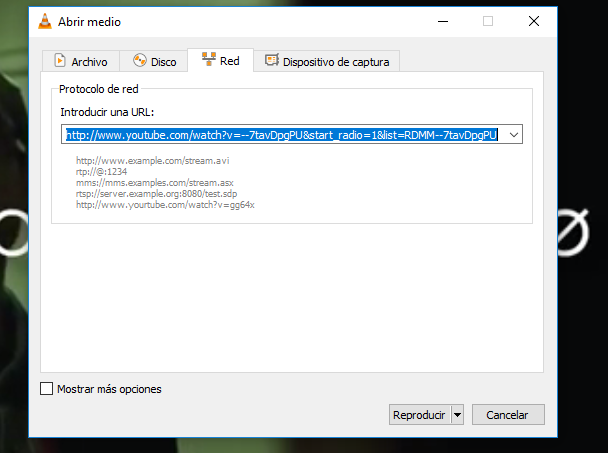 Copiamos el link o url del vídeo de youtube que queremos ver ,a la opción reproducir