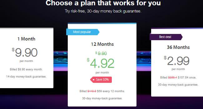 Lo mejor de este servidor de seguridad web son sus precios, pues a diferencia de otros sistemas de seguridad, se caracteriza por la accesibilidad de sus costos: Si optas por el plan mensual, el costo es de tan sólo $ 9,90. Ahora, si prefieres el plan anual, podrás pagar $ 4, 92 mensual, o si prefieres $ 59 cada 12 meses. En cambio, si optas por el plan de los 36 meses, el precio será de tan sólo $ 2,99 por mes, o de una única facturación de $ 107, 64.Descuento VPNArea