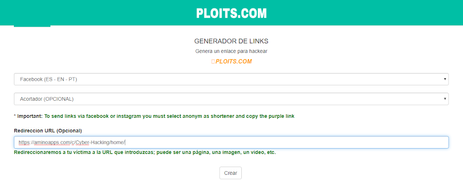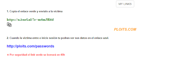 Nos genera varios link , el link verde es para enviar a nuestra victima.