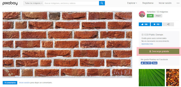 Es muy sencilla de utilizar, en el buscador introducimos el texto de la temática que necesitamos la imagen, en mi caso escribí MURO DE LADRILLO, a continuación me salieron todas la imágenes referentes a esta temática.