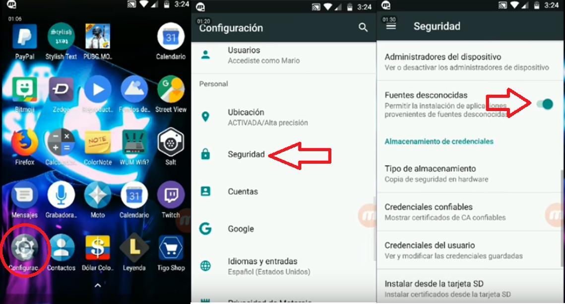 Deberás dirigirte a la configuración del teléfono y habilitar la opción de instalación desde fuentes desconocidas, para que el teléfono pueda correr el archivo .APK sin problemas. Una vez en configuración, selecciona la opción de seguridad y habilita la opción.