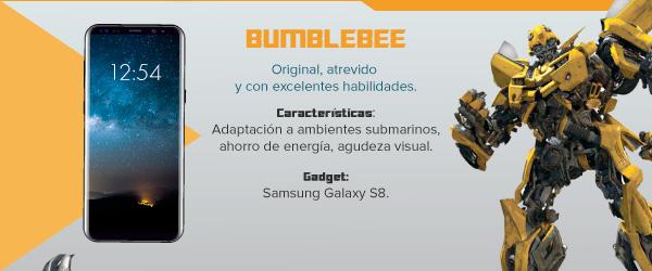 Sin embargo, Bumblebee logra sorprender a todos con sus increíbles características que se asemejan a las del Samsung Galaxy S8, tales como poder adaptarse a ambientes submarinos: resistencia al agua, ahorro de combustible: ahorro de batería, y una agudeza visual inigualable: pantalla Infinity Display.