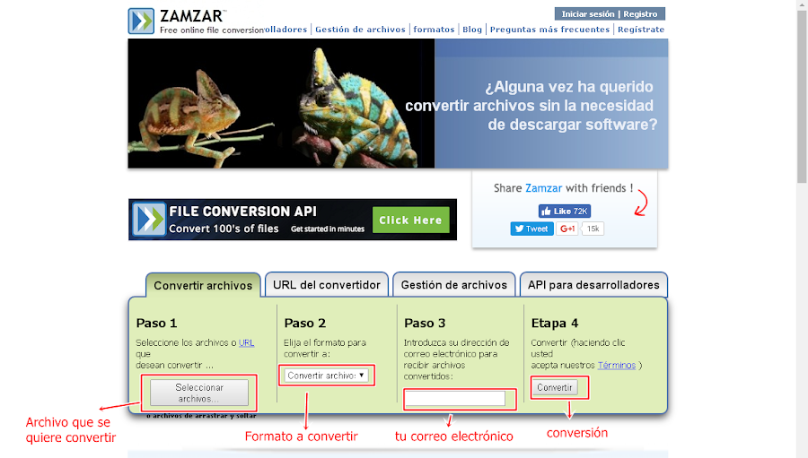 Pues con una herramienta online que es una maravilla: Zamzar que convierte archivos sin la necesidad de descargar ningún sofware. Convierte ficheros de casi cualquier formato a casi cualquier otro mediante un procedimiento tan simple como es subir el fichero a esta página, y realiza la conversión y te lo envía a tu correo electrónico en el formato que tú elegiste. No hay que registrarse ni nada.